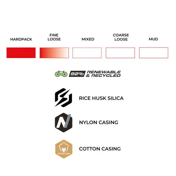 Sa carcasse en coton bio multi-couches, renforcée au latex naturel, combinée au nylon recyclé Seawastex® provenant de filets de pêche usagés, assure souplesse, robustesse et sensations incomparables. La protection du talon, la ceinture anti-crevaison et les flancs renforcés garantissent une stabilité et une fiabilité optimales sur tous les parcours.