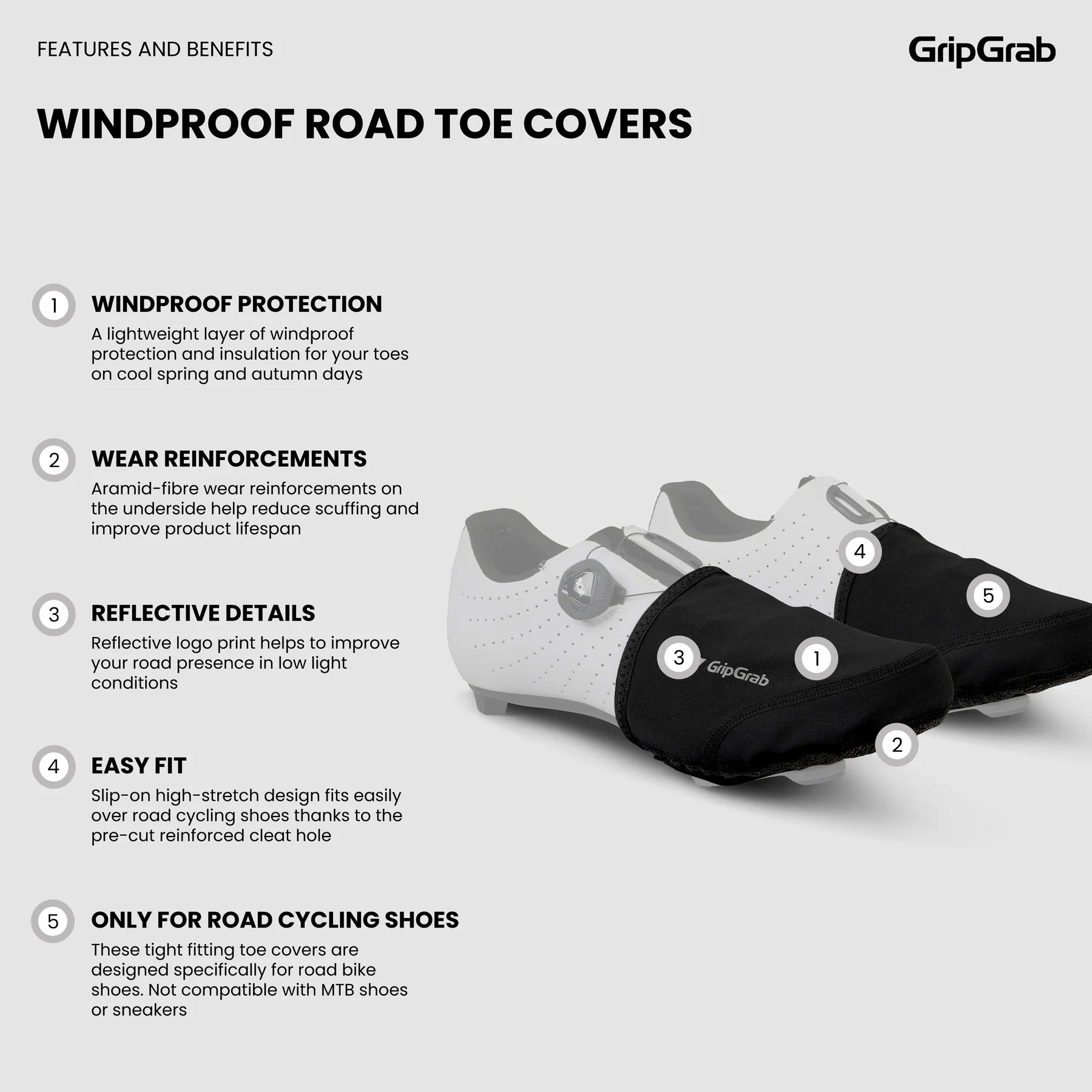 I copripunta GRIPGRAB WINDPROOF sono perfetti per il ciclismo su strada in primavera e in autunno. Facili da indossare, si infilano rapidamente nelle scarpe per proteggere i piedi da vento e pioggia.