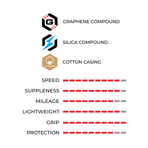 Le composé Race Formulation Graphene + Silica assure vitesse et grip, tandis que la carcasse 320 TPI Cotton casing garantit souplesse et maîtrise en virage. L’ajout du Bead Shield renforce la protection là où elle est essentielle, complétant un pneu pensé pour la performance durable.