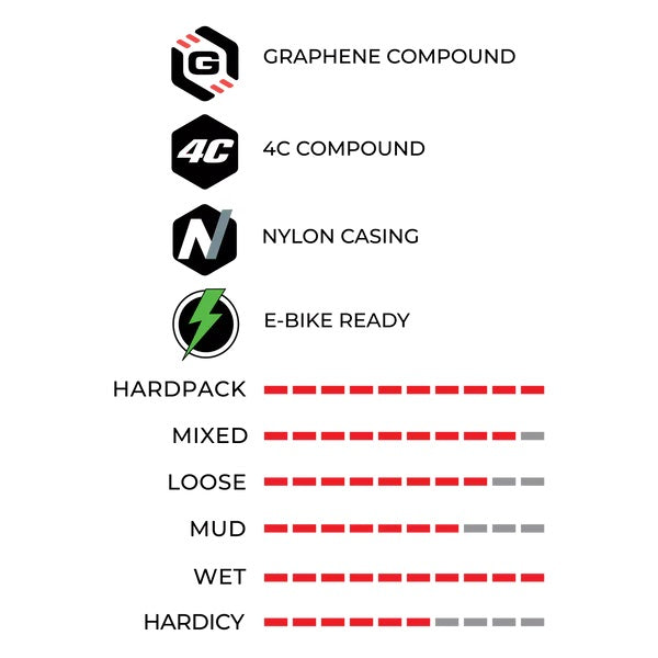 Il battistrada 4C è composto da 4 zone in grafene che garantiscono maggiore resistenza e una trazione senza rivali sui percorsi tecnici. L'E-Agarro è inoltre progettato attorno ad una carcassa Trail TNT da 120 TPI che garantisce prestazioni elevate e resistenza superiore agli strappi e alle forature.