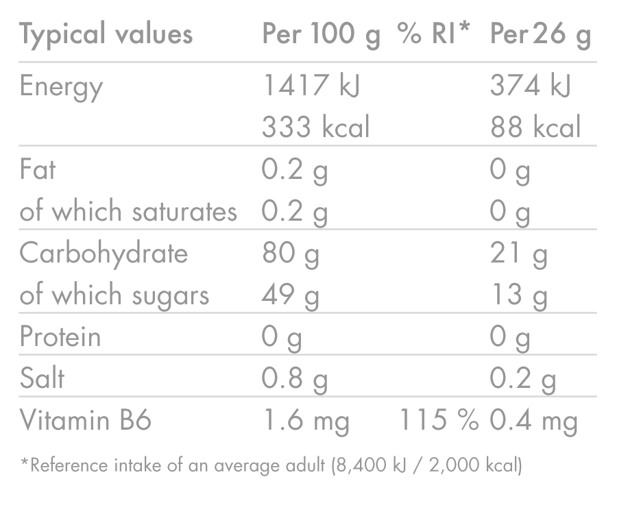 | Energia divisa | 6 gommine = 21,5 g di carboidrati per bustina |